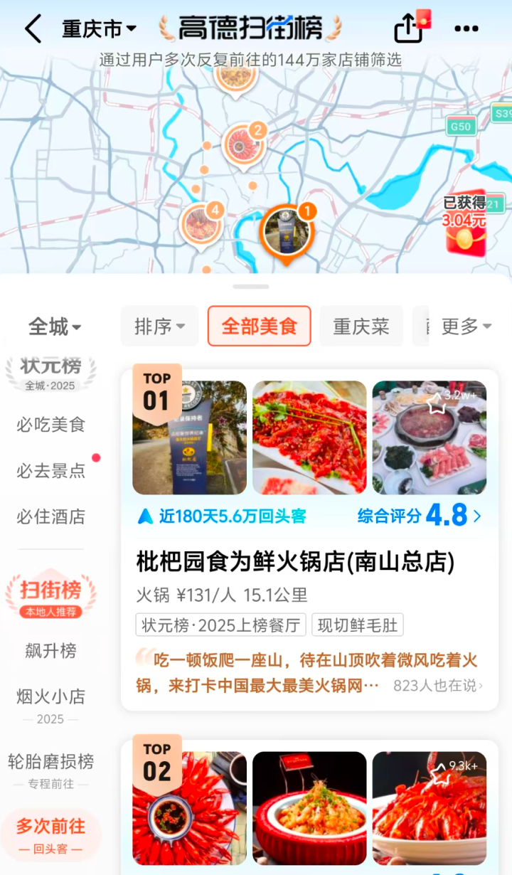 我本人是重庆人,国庆假期回了重庆一趟。所以我刻意体验了一下高德扫街榜在重庆的情况。