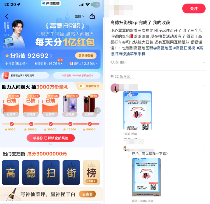 或许是初期效果不错,而且阿里做团购的确相当需要补齐内容侧短板,国庆期间高德给出了远超之前的激励和补贴力度。每天发放1亿元红包,抽100台iPhone17,以至于小红书上只要一搜扫街榜,就会出现大量的扫码互助贴和评论。
